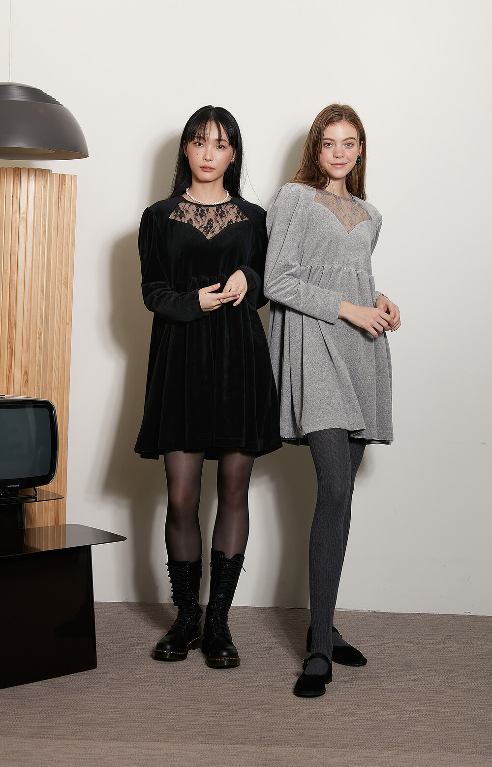 캐쥬얼한 코튼 벨로아 소재로 레이스와 절묘하게 결합하여 우아하기도 하고 소녀스럽기도 한 라인 을 실현하였습니다.