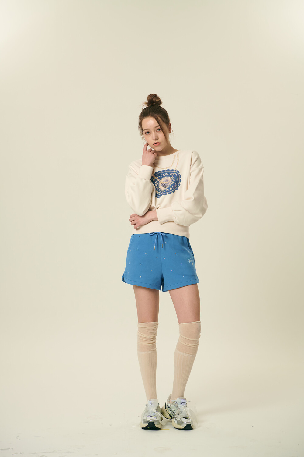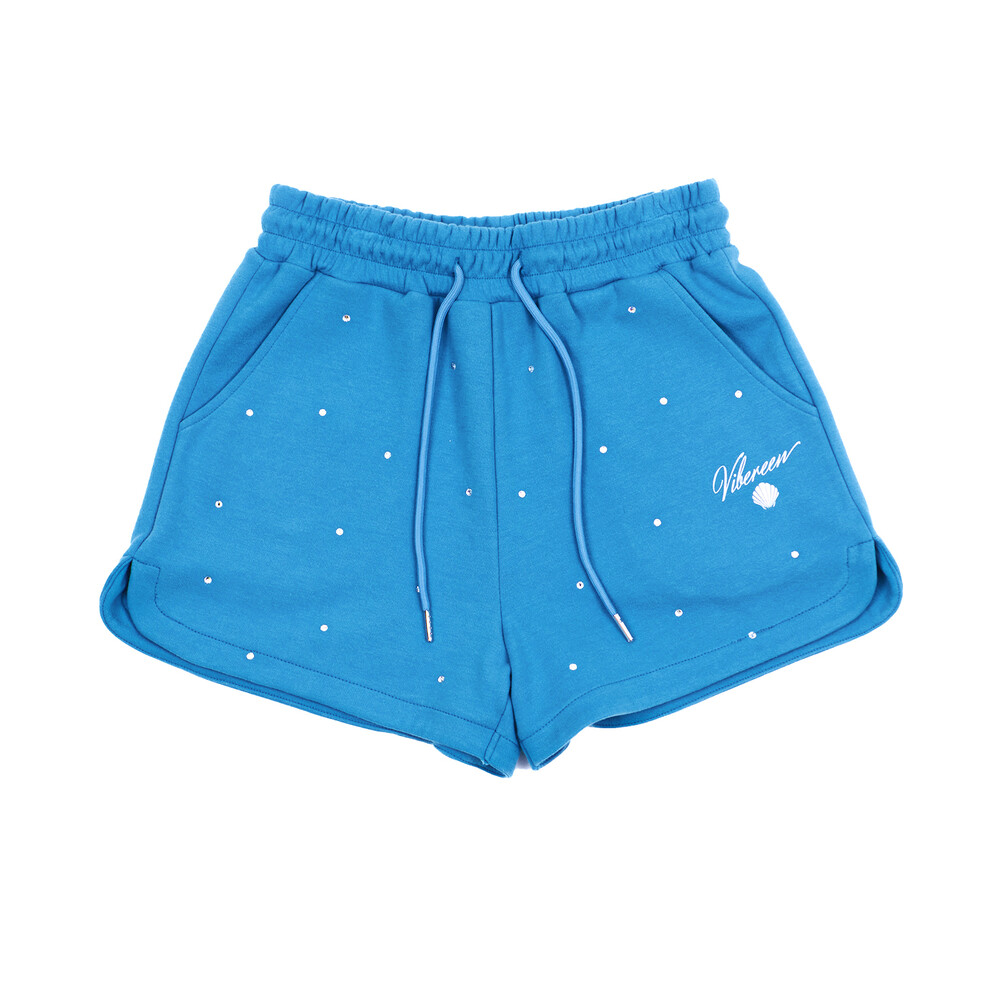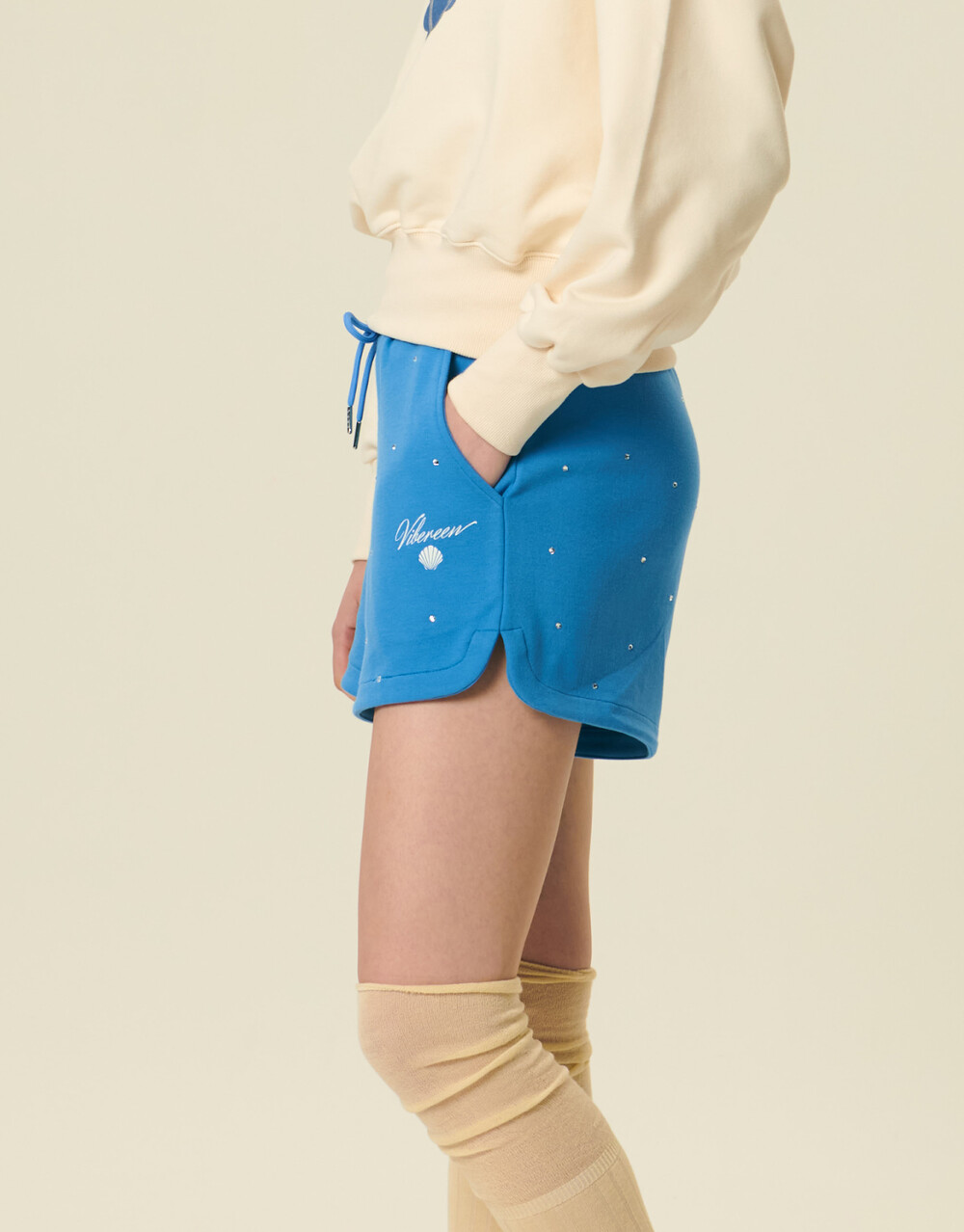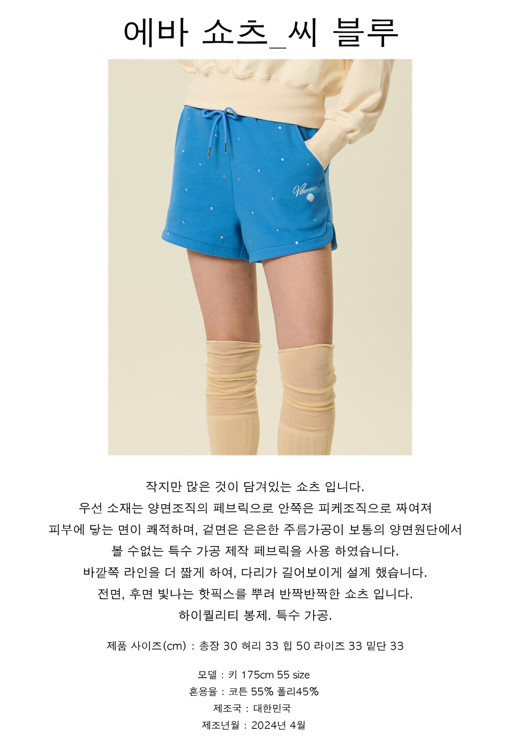 바깥쪽 라인을 더 짧게 하여, 다리가 길어보이게 설계 했습니다. 전면, 후면 빛나는 핫픽스를 뿌려 반짝반짝한 쇼츠 입니다.