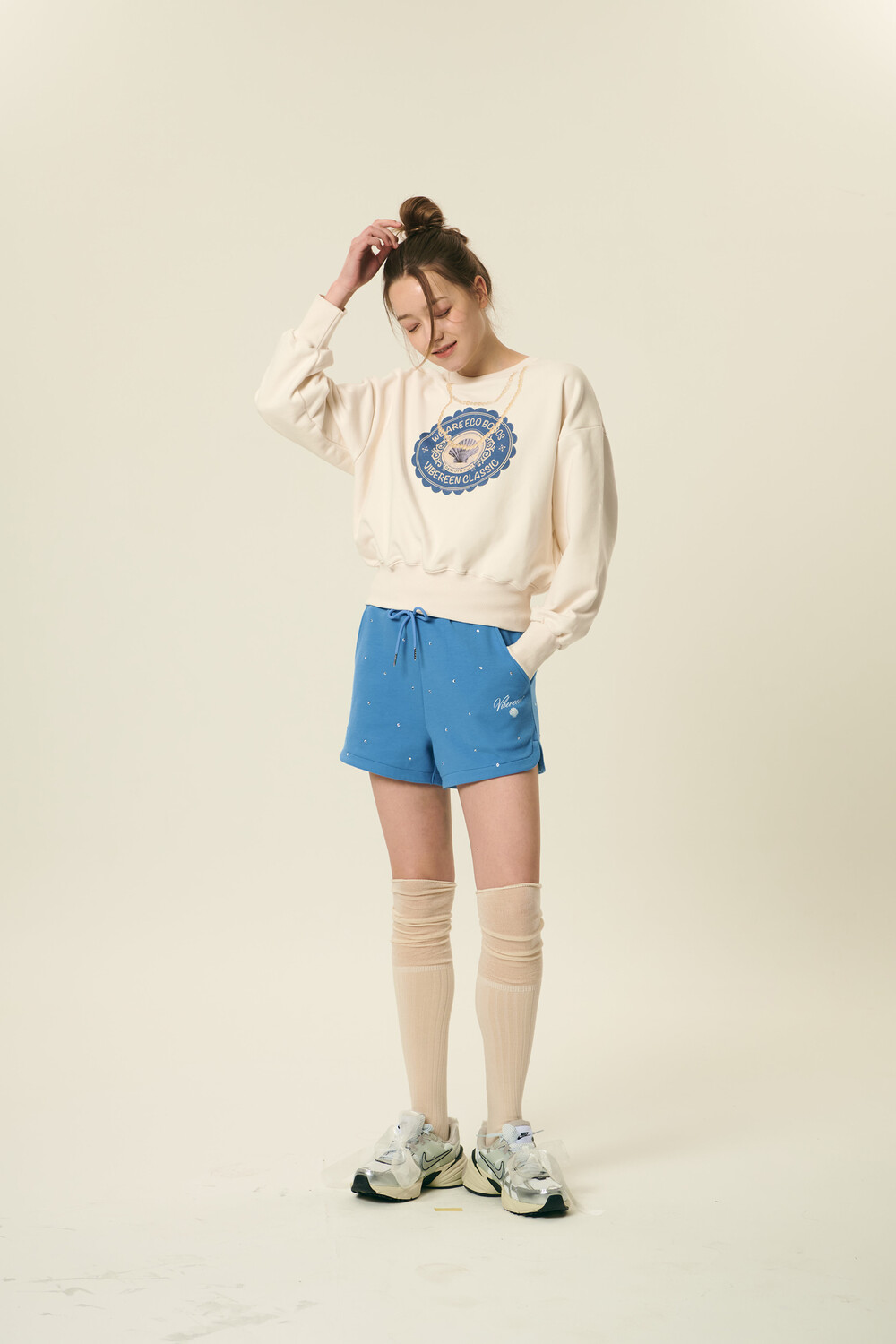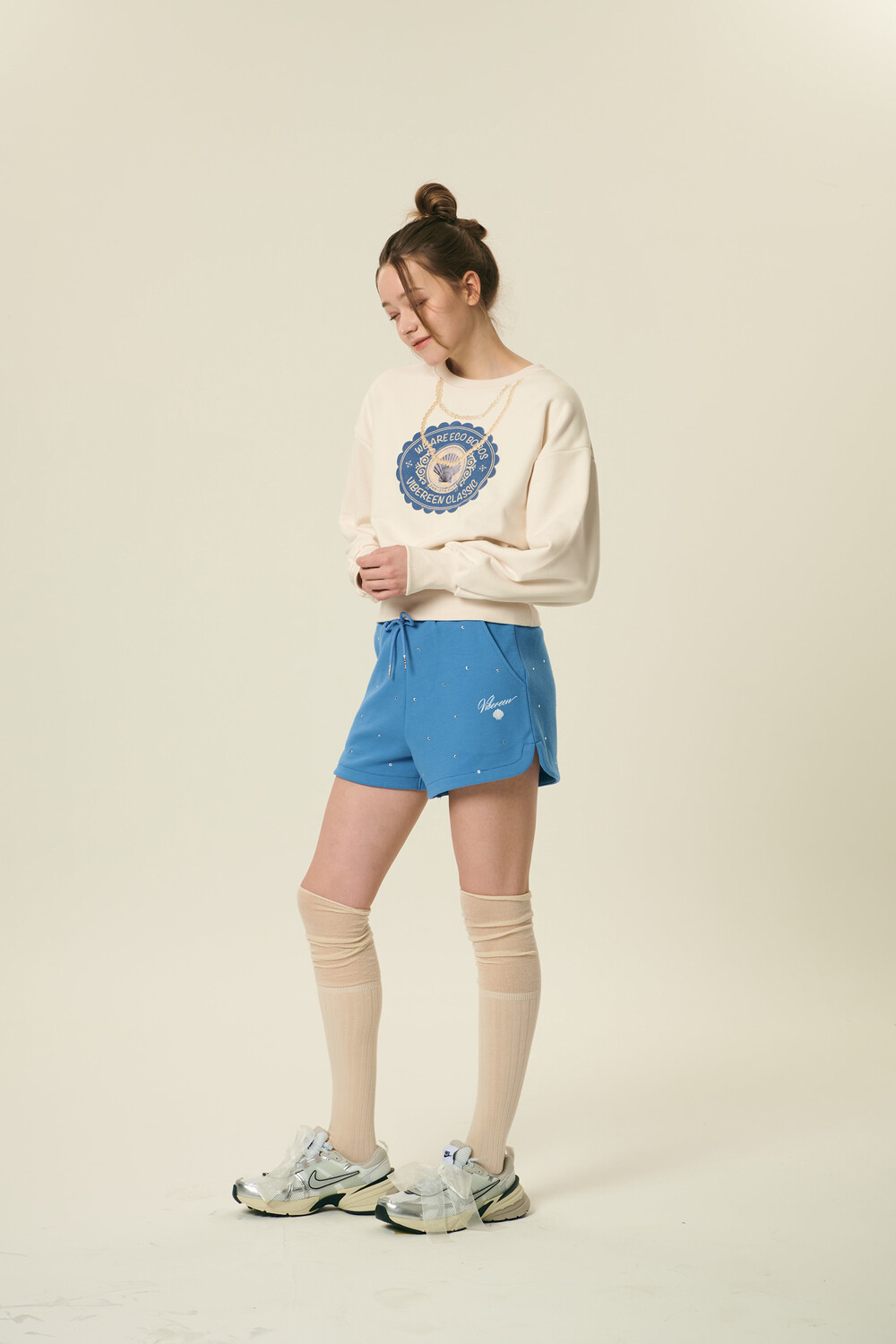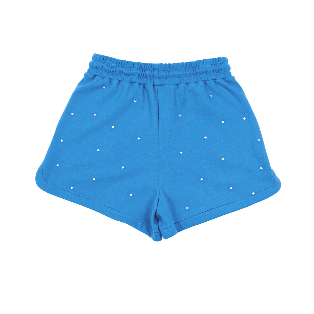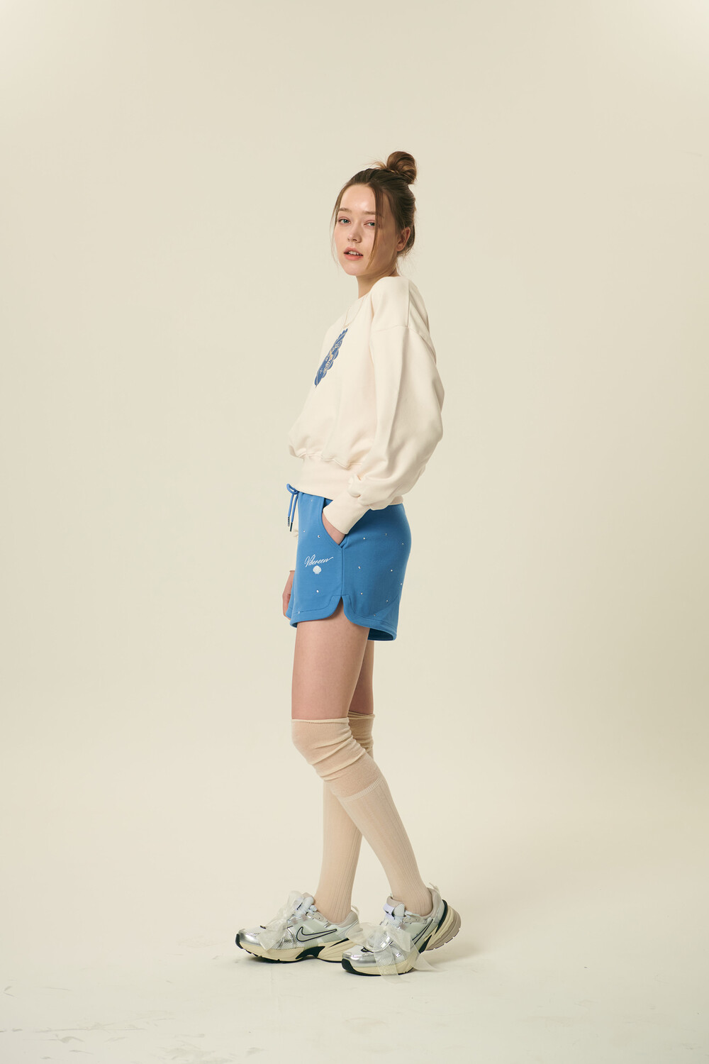 바깥쪽 라인을 더 짧게 하여, 다리가 길어보이게 설계 했습니다. 전면, 후면 빛나는 핫픽스를 뿌려 반짝반짝한 쇼츠 입니다.