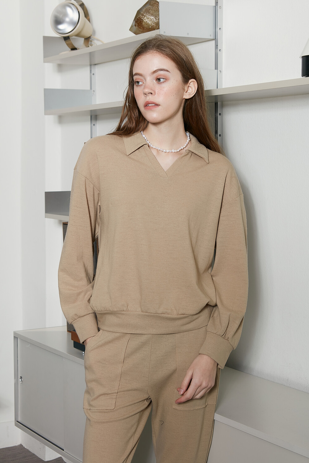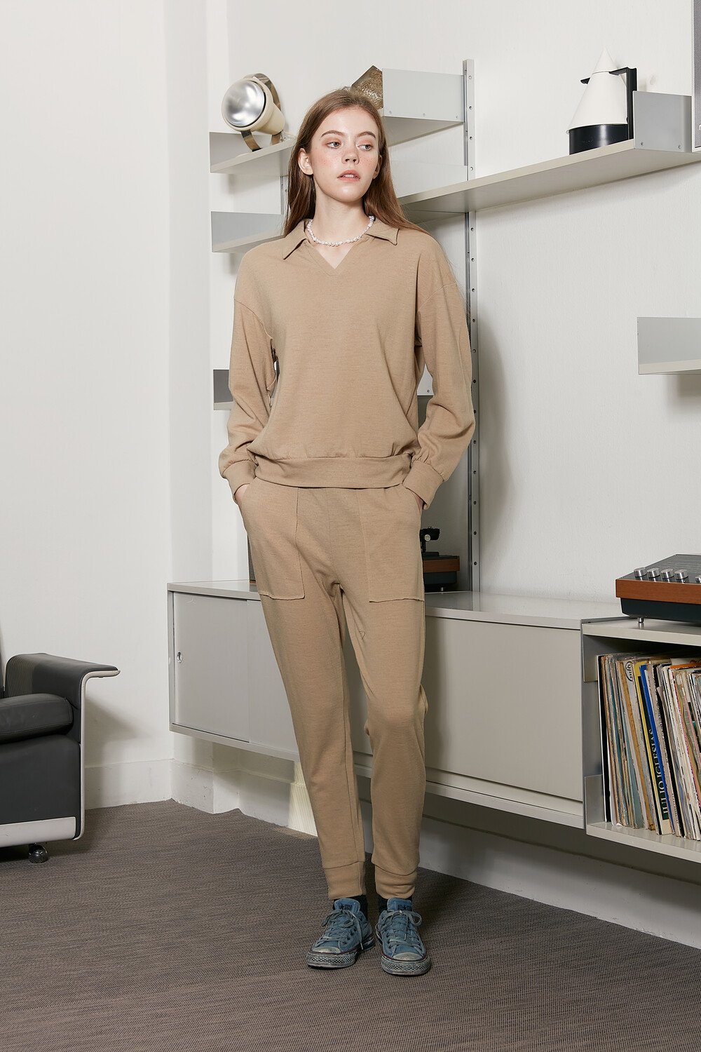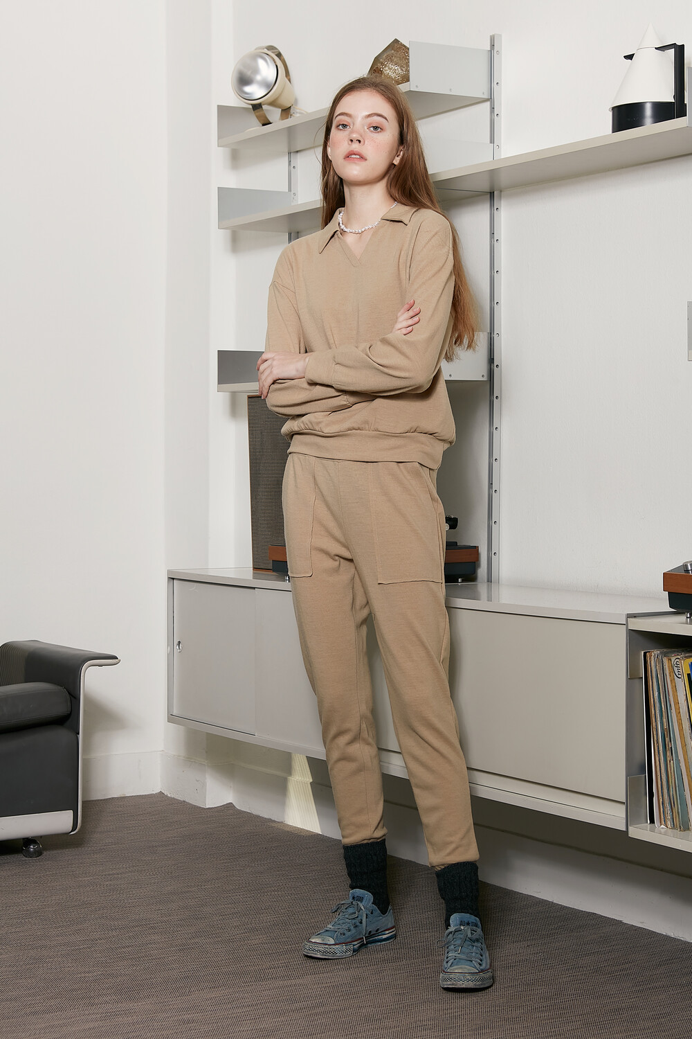 바이브린의 바지락 카라티 & 팬츠의 소재는 18.5 마이크로 배털로 최상급 Fine wool 100% 로 편직 하였습니다.