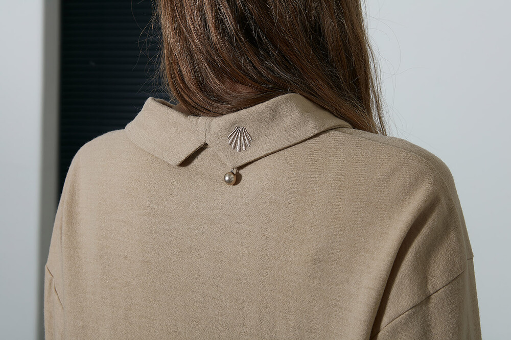카라 뒤쪽 트임을 주어 조개 자수와 진주단추로 위트있는 디테일을 추가하였습니다.