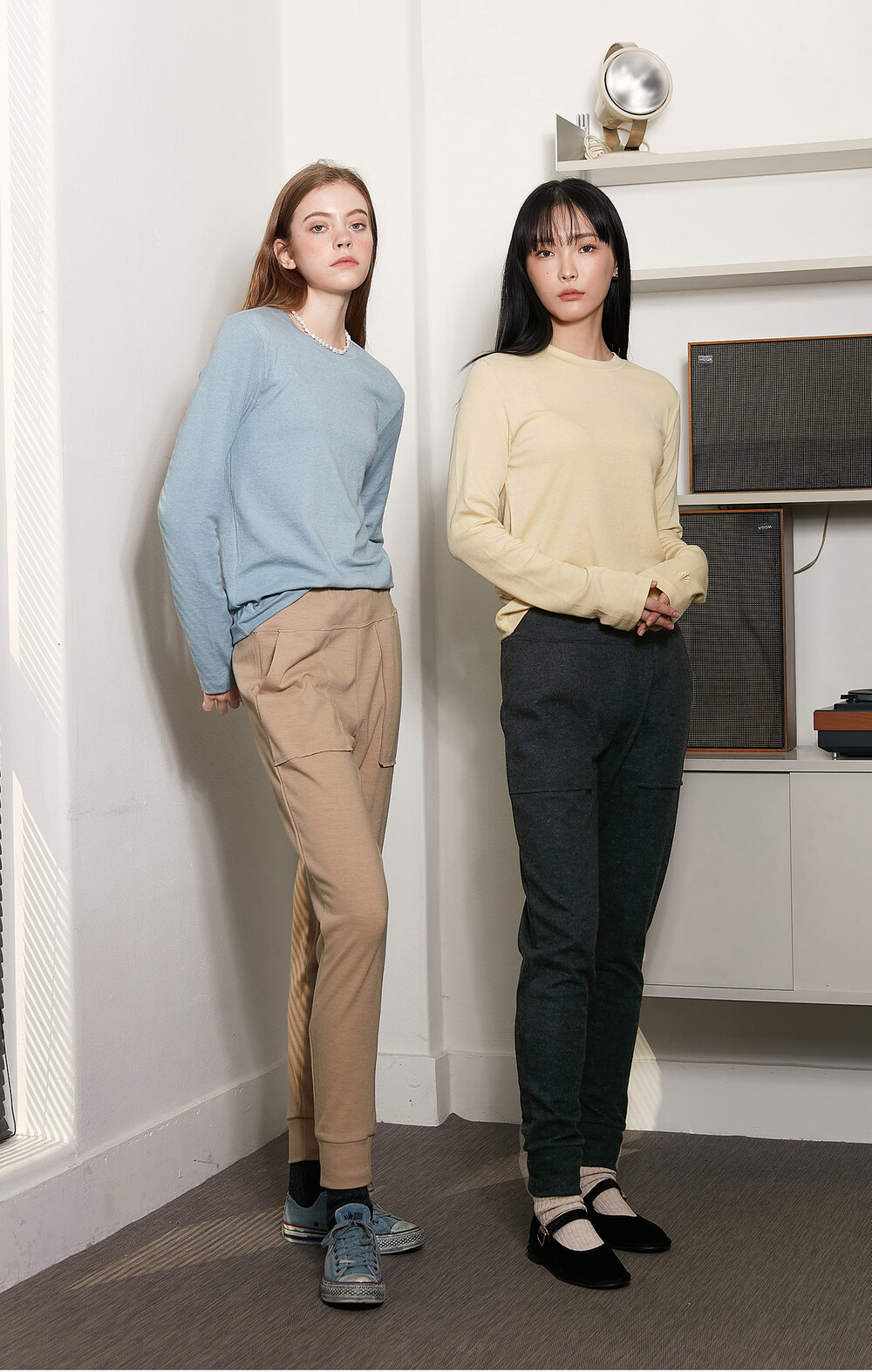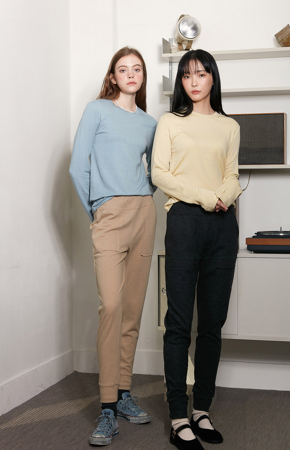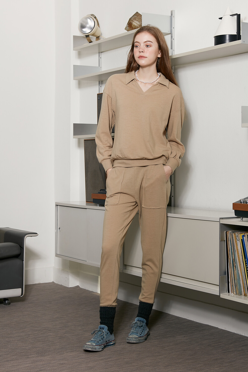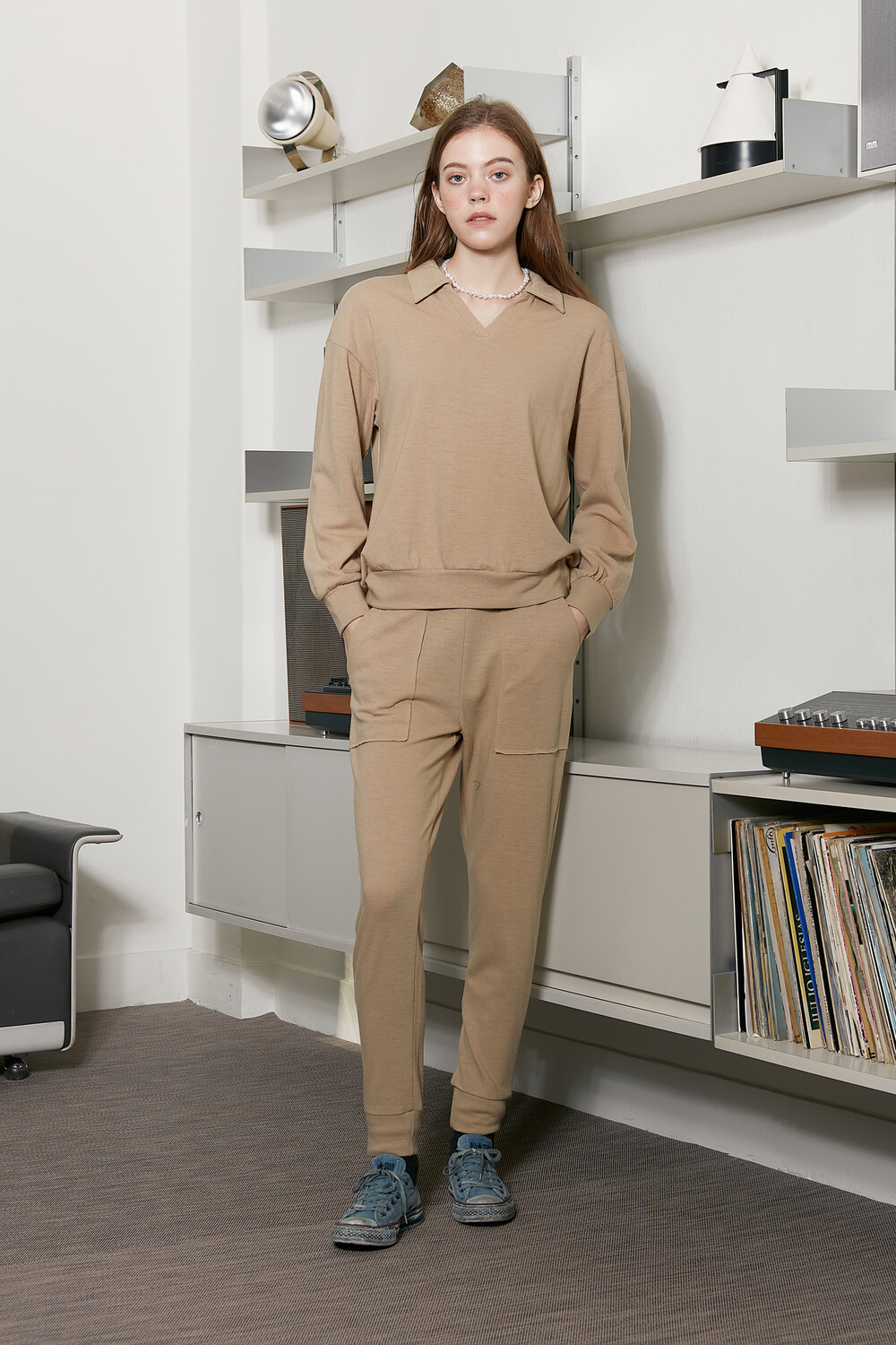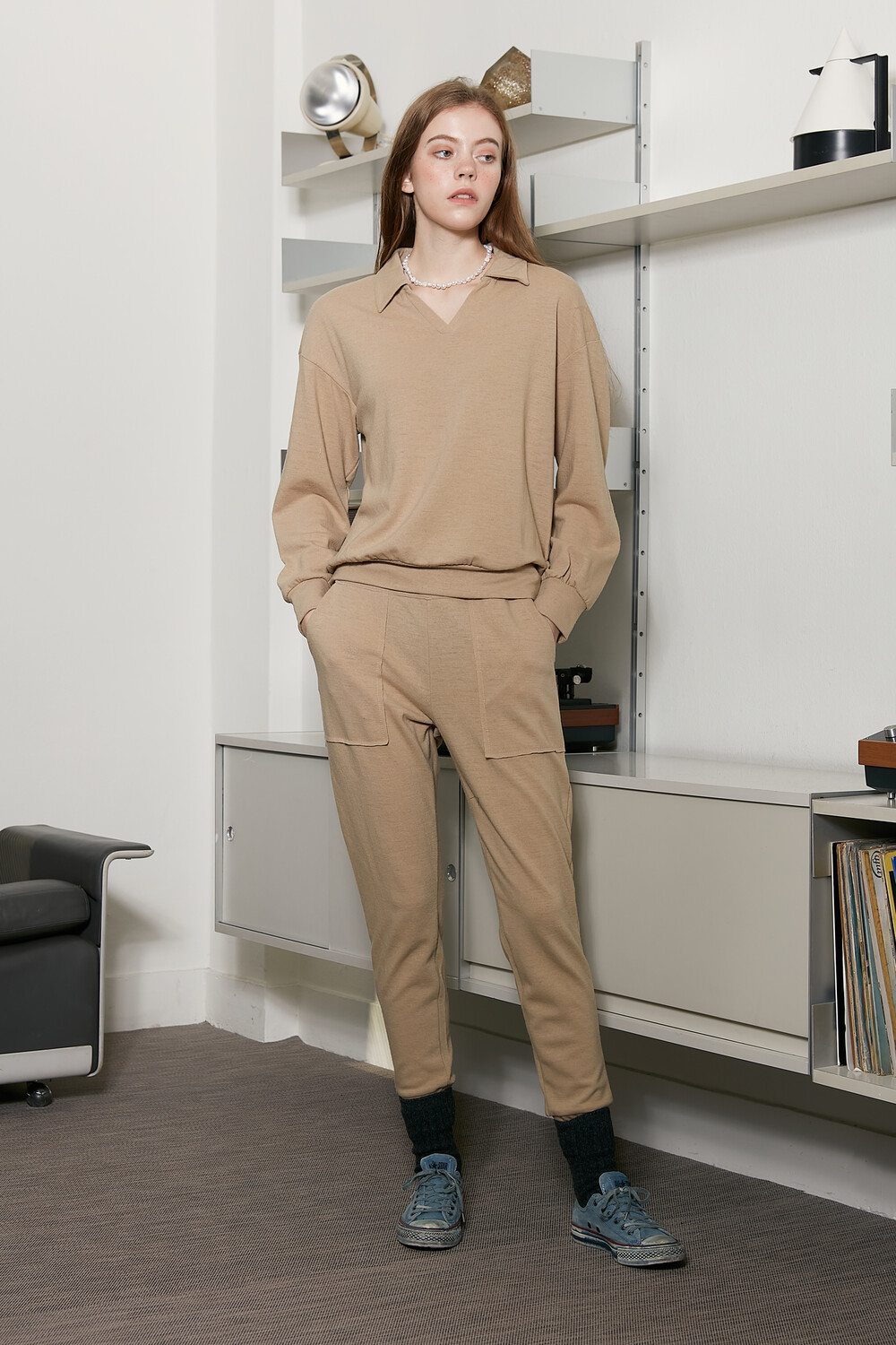 바이브린의 바지락 카라티와 세트로 연출도 좋지만 니트 또는 터틀티와의 연출도 내추럴한 룩이 완성됩니다.