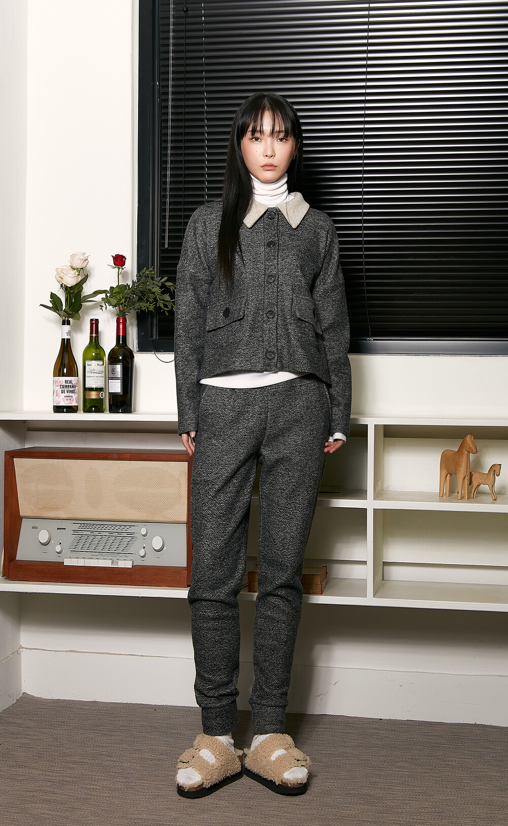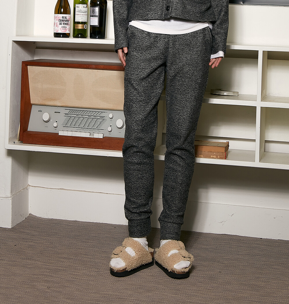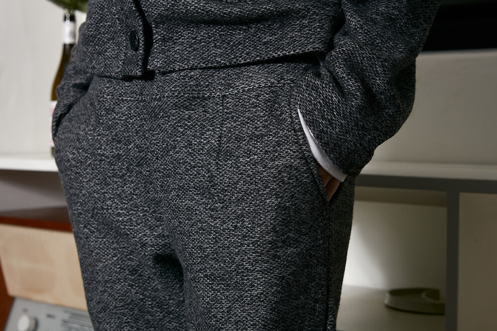 클램 울쭈리 팬츠 차콜 컬러의 겉 포면감 은 울 고유의 텍스쳐를 살려 쭈리조직으로 표현되었습니다.