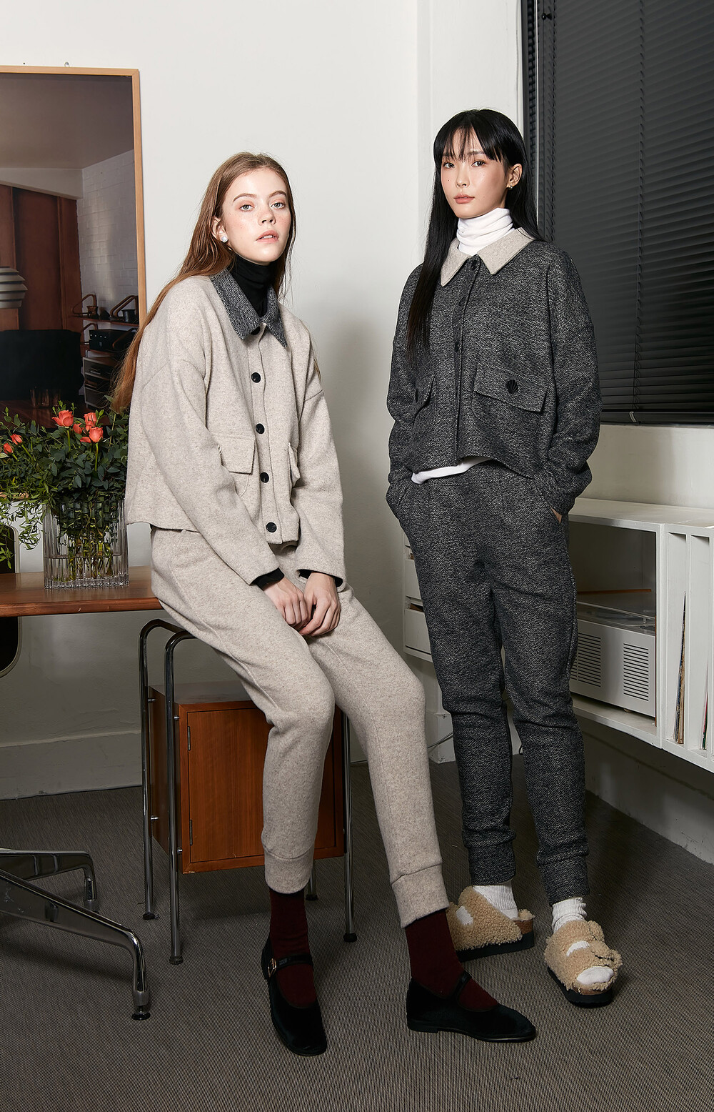 니트조직의 목이 긴 양말을 위로 해서 연출해도 좋도록 밑단부분은 좁아지도록 디자인하여 캐주얼하고 내추럴한 룩을