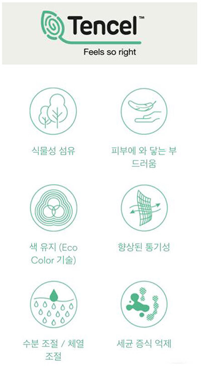 또한 텐셀 섬유 자체가 수분이 높아 촉촉하여 효과적인 수분조절이 가능하고, 흡습성에 강하여 쾌적합니다.
