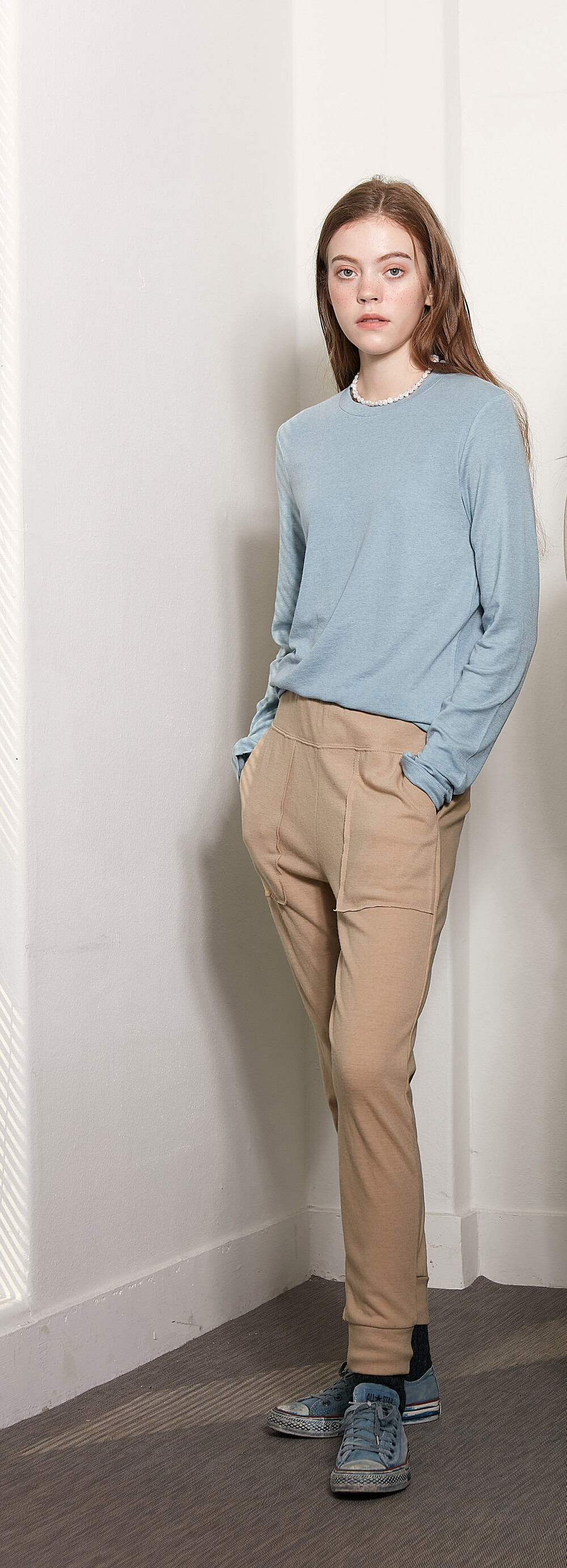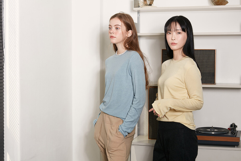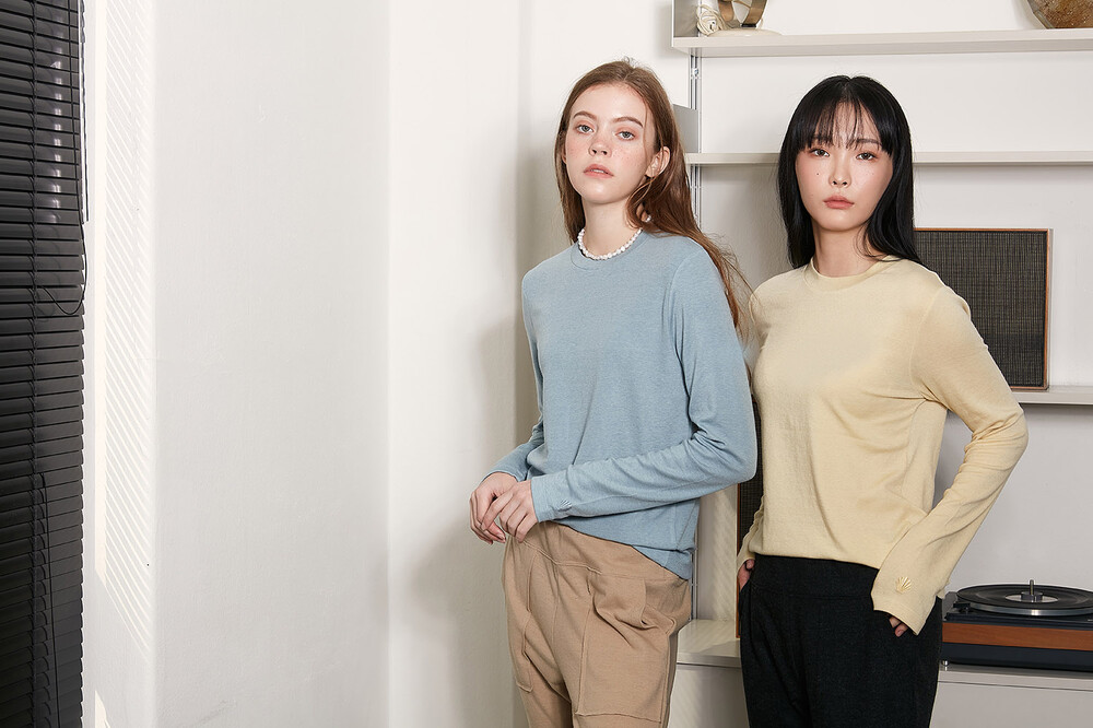 텐셀과 울 함유가 된 터틀 티셔츠는 보통 얇아서 다루기 힘들고, 그로 인해 바디 실루엣이 드러나 불편한 제품이